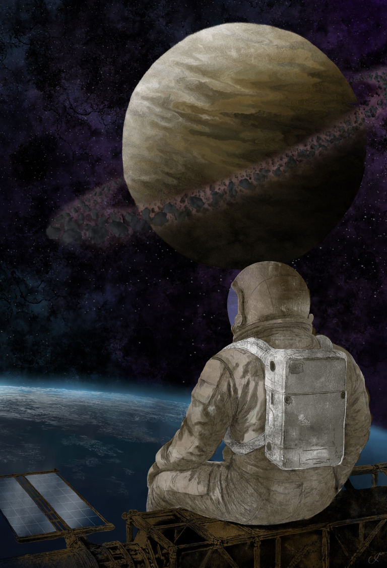 Un astronaute solitaire contemple la Terre depuis son satellite, avec en toile de fond une majestueuse planète entourée de ses anneaux. Un moment de contemplation dans l'infini cosmique