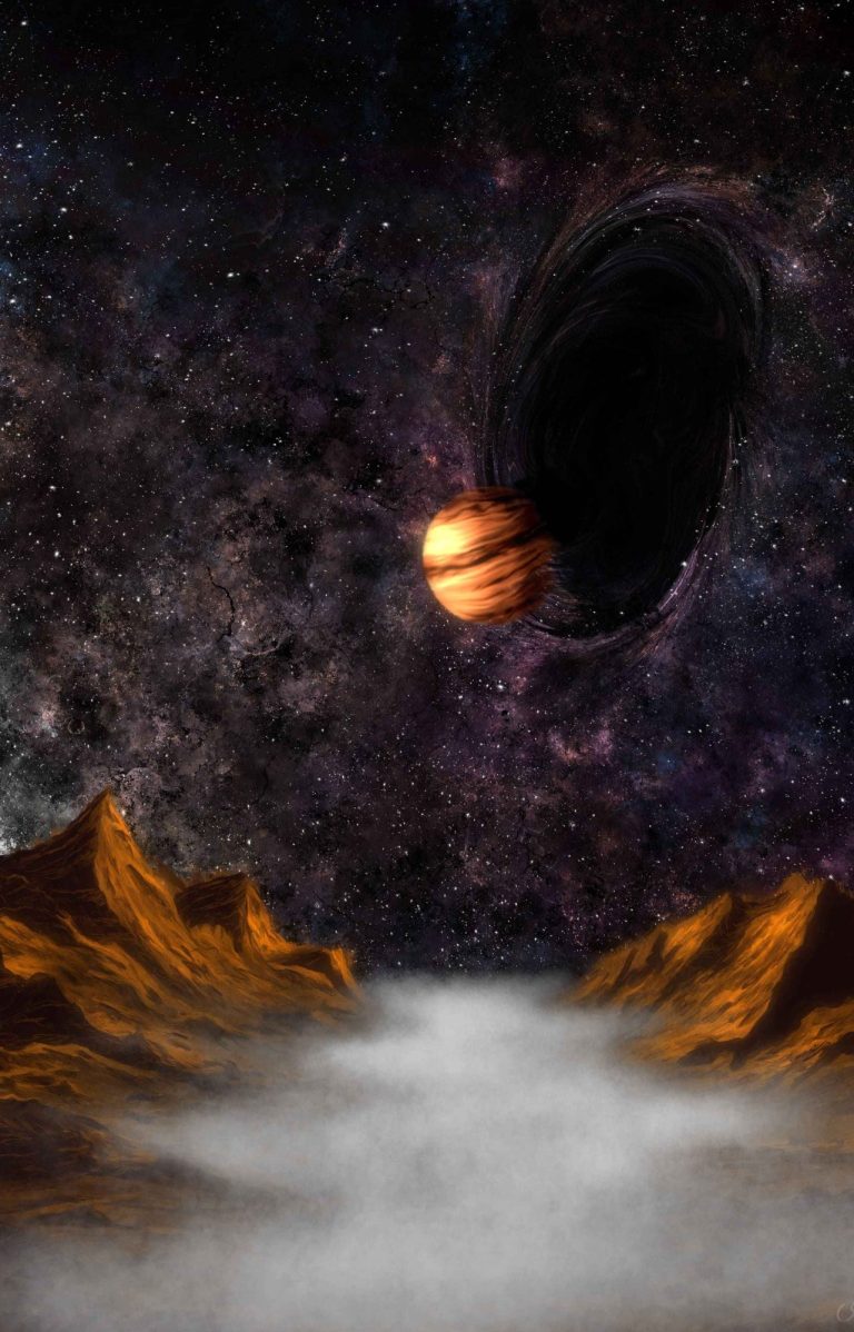 Un paysage cosmique fascinant où une planète mystérieuse côtoie la gravité dévorante d'un trou noir, capturant l'immensité et la beauté de l'univers